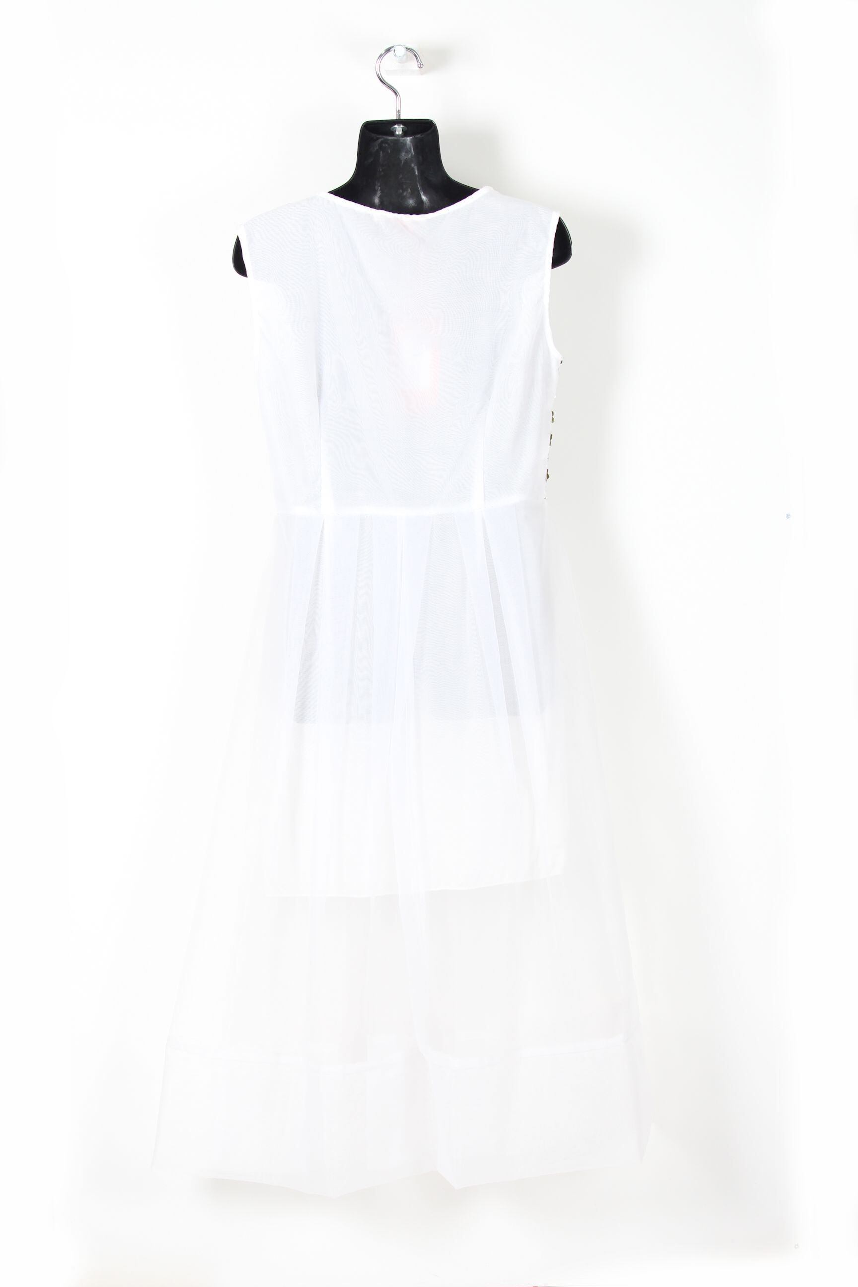 深めVネックがキレイな白ワンピース。胸元グリーンのお花の装飾が素敵です。スカートはセミタイトなミニ丈の上にオーガンジーのロング丈がふわりとかかった二重のデザインです。特別な夏の日の装いに。 【商品詳細】 ・イタリアインポート【IMPERIAL】 ・サイズ L